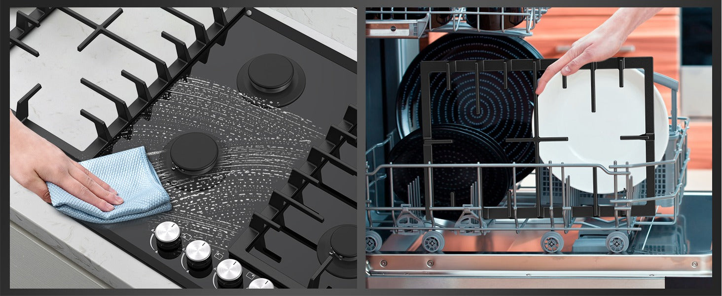 【TEMPERED GLASS GAS COOKER EASY TO CLEAN】Black gas cooktop surface is made of 8MM black tempered glass panel, which is stain and heat resistant, easy to clean, smooth and durable. The glass prevents liquid spillage deep into the countertop